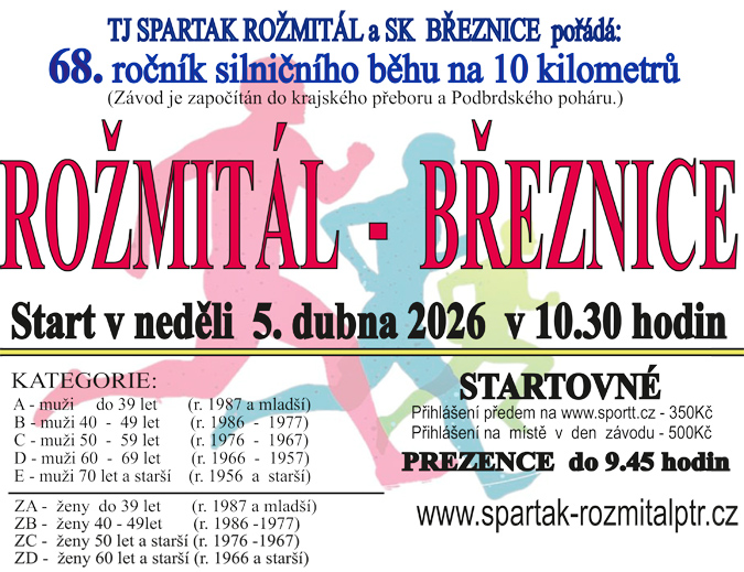 TJ Spartak ROŽMITÁL a SK BŘEZNICE pořádají 68. ročník silničního běhu na 10 km ROŽMITÁL – BŘEZNICE, a to v neděli 5. dubna 2026. Start závodu v 10.30 hodin před stadiónem TJ Spartak ROŽMITÁL. Cíl běhu na stadiónu v SK BŘEZNICE.