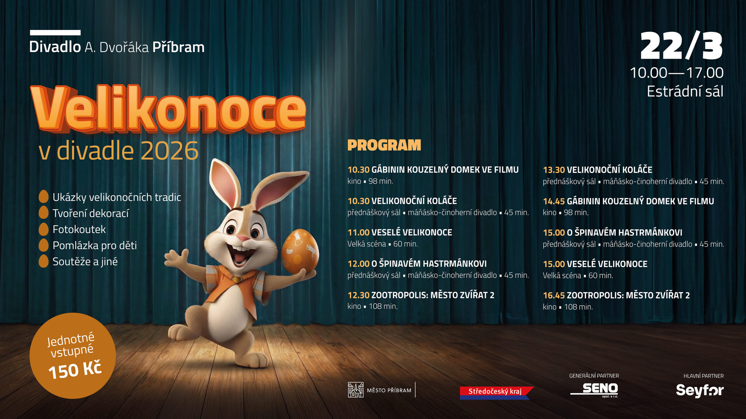 Velikonoce v divadle se konají v neděli 22. března v čase od 10 do 17 hodin. Stejně jako v předešlých letech budou připraveny ukázky velikonočních tradic, tvořivé dílničky, pohádky v kině i divadle, pomlázka pro děti a chybět nebude ani fotokoutek.