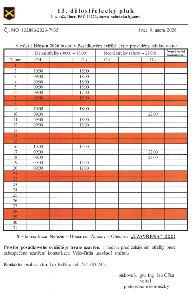 Na území CHKO Brdy jsou zřízena bezpečnostní pásma, která jsou pro návštěvníky oblasti trvale nepřístupná. K těmto pásmům se řadí Posádkové cvičiště Jince, kde se provádějí ostré střelby podle následujícího rozpisu na měsíc březen 2026.