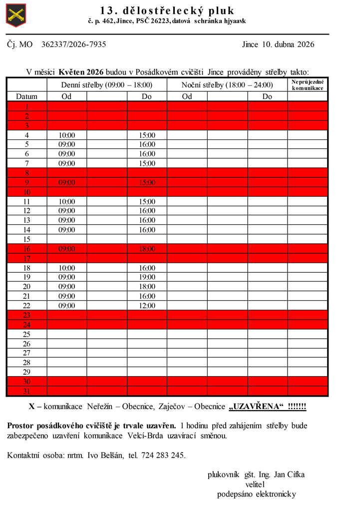 Ještě informace na duben - ve dnech 28. 4. - 29. 4. 2026 proběhne v rámci výcviku 13. dp, střelba cvičnou municí ze 152 mm ShKH DANA. Výstřel má pouze zvukový efekt jako při ostré střelbě, tzn. zvýšená míra hluku.